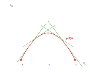 • Una función es cóncava (o concava hacia abajo) en un intervalo (a,c), si para todo punto "b" del intervalo la recta tangente en ese punto queda por encima de la función.