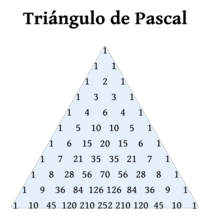 El triángulo de Pascal es una representación de los coeficientes binomiales ordenados en forma triangular. ![]() También conocido como triángulo de Tartaglia, especialmente en Italia, en honor al algebrista italiano Niccolò Fontana Tartaglia (1500–77).
