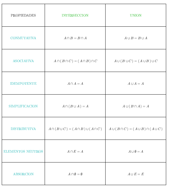 idempotente, simplificación, distributiva, existencia de elemento neutro y absorción: