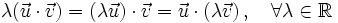 • Asociativa mixta: \lambda (\vec{u} \cdot \vec{v})=(\lambda \vec{u}) \cdot \vec{v}= \vec{u} \cdot (\lambda \vec{v})\, , \quad \forall \lambda \in \mathbb{R}
