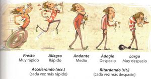 La velocidad de la música se expresa con las indicaciones de Tempo-Aire-Movimiento-Dinámica... Todas estas palabras son sinónimas, significan lo mismo. Para indicar una velocidad constante se utilizan las siguientes palabras italianas: