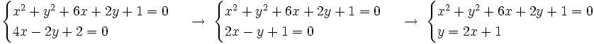 y la circunferencia .Actividad: Para poder comprobar los resultados en la escena, vamos a poner la ecuación de la recta en forma explícita, Y a partir de la ecuación de la circunferencia tenemos que hallar su centro y su radio, ya que la escena también nos lo exige: Su representación gráfica puedes verla en la escena:
